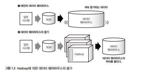 가속도적으로 늘어나는 데이터 처리에 Hadoop을 도입하고, 비교적 작은 데이터 혹은 중요한 데이터만을 데이터 웨어하우스에 넣는 하이브리드 방식이 늘어나게 되었다. 이를 통해 데이터 웨어하우스의 부하를 줄일 수 있게 되었다.