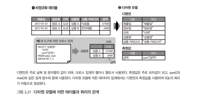 OLAP는 데이터 집계를 효율화하는 접근 방법 중 하나로, '다차원 모델;의 데이터 구조를 MDX(multidimensional expressions) 등의 쿼리 언어로 집계한다.