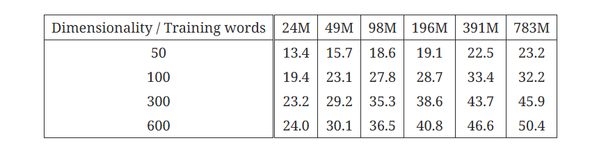 그 결과, 단어를 표현하는 벡터의 차원을 늘릴수록 정확도는 늘어났지만, 동시에 계산량도 함께 늘어나기 때문에 적절한 조절이 필요했다.