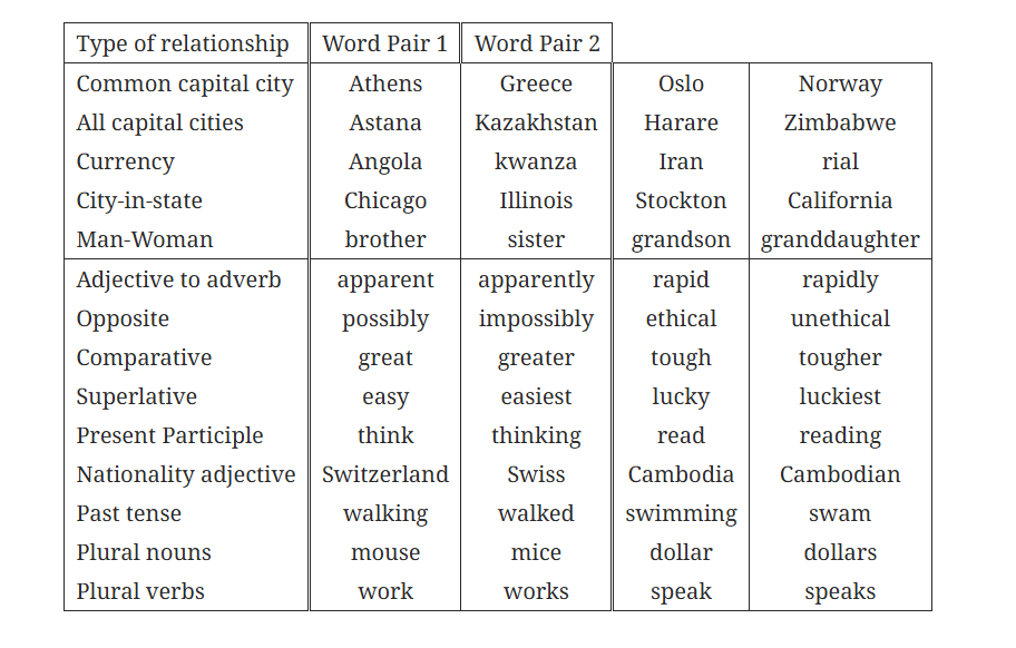 본 논문에서는 유사한 단어쌍을 수집하고 조합해 의미적/문법적 질문 9종류를 만들고, 벡터 연산 결과에서 가장 가까운 단어와 정답 단어가 정확히 같아야만 정답으로 처리해 품질을 측정했다.